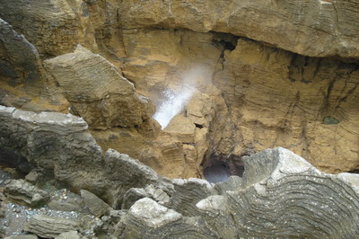 Weiter ging’s zu den „Pancake Rocks / Blowholes“, Felsen die durch die so genannte „Schichtverwitterung“ die Form von dicken Pfannkuchenstapeln angenommen haben. Die Blowholes sind Aushöhlungen, wo das Meer bei Flut hineinläuft und durch die Kraft der auf die Felsen auftreffenden Wellen je nach Witterung das Wasser mit enormer Kraft (und Höhe) herausspritzt – bei diesen Gewalten wird einem erst bewusst, wie hilflos man eigentlich gegenüber der Natur ist.