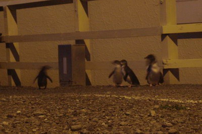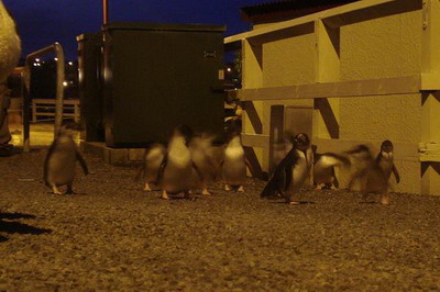 Von Timaru ging’s ab nach Oamaru der selbsternannten Hauptstadt der Pinguine. Mich würde es nicht wundern, wenn man dort sogar Klopapier mit Pinguinen kaufen kann. Die dort brütenden Pinguine wandern an einer bestimmten Stelle nach Sonnenuntergang zu ihren Nestern. Natürlich kann man das ganze Ereignis nur im Visitor-Center, von einer eigens dafür aufgestellten Tribüne und der Bezahlung von ~ 15,- Euro aus einer sicheren Entfernung beobachten, da sich die Pinguine sonst gestört fühlen. Da wir aber aus sicheren Quellen gehört haben, dass sich die Pinguine auch ohne Bezahlung zeigen, legten wir uns am Parkplatz direkt vorm Center auf die Lauer und tatsächlich watschelten sie kurz nach Sonnenuntergang über den Parkplatz. Sie liefen freiwillig direkt bei den Autos und ohne Scheu cirka einem Meter an uns vorbei (von wegen Sicherheitsabstand und gestört). Leider soll man Pinguine nicht mit Blitz fotografieren und auf Grund der langen Belichtungszeit sind die laufenden Pinguine etwas verschwommen).