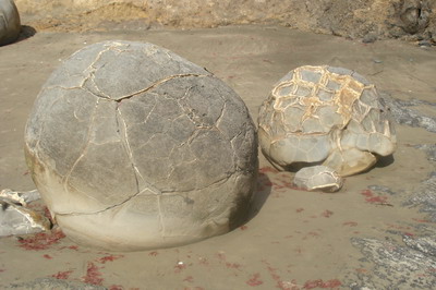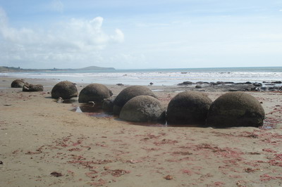 Da wir noch keinen Schlafplatz hatten machten wir uns erst um 23:00 auf die Suche nach einem passenden Stellplatz. Als wir endlich um halb zwölf einen gefunden hatten, gab es nur noch schnell belegte Brote im Auto als Abendessen. Dies blieb von unserem Campingnachbar nicht unbemerkt. Nach einer schönen Nacht am Strand mit Pinguinträumen, kam er in der Früh als wir munter wurden gleich mit zwei frischen Kaffees rüber – anscheinend hatte er Mitleid mit uns. Frisch gestärkt, sahen wir uns die ums Eck liegenden „Moeraki Boulder“ an. große, runde Felsen am Strand, die wie überdimensionale Fußbälle aussehen. Einer Maori Sage nach sind die Boulders durch Körbe, die ein in Seenot geratenes Schiff verloren hat entstanden. Der Wissenschaft nach sind sie in vielen Millionen Jahren durch symmetrische, radiale Kristallisierung um organisches Material entstanden. Irgendwie erinnern sie etwas an Dino-Eier und in einem wurde sogar ein Knochen von ihnen gefunden.