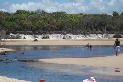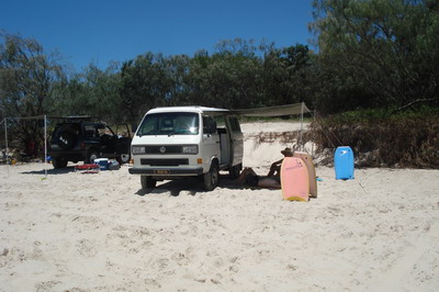 Am Abend machten wir uns dann auf den Weg nach Bribie Island. Dort wohnt ein Bekannter von Jörg (Freund von Tom) und das nützten wir aus, um uns wieder mal auf Deutsch einige Geheimtipps geben zu lassen. Rudi und Monika sind eigentlich von Gschwandt bzw. Vorchdorf und wohnen jetzt seit über 20 Jahren mit ihren Kindern Michelle und Alex in Australien. Echt nette Leute!! Sind eigentlich davon ausgegangen nur kurz auf einen Kaffee vorbeizuschauen, aber irgendwie sind 3 Tage draus geworden und wir wurden extremst verwöhnt. Am Donnerstagabend gab’s unser 1. Bier in Australien (is so teuer, das wir daweil ohne ausgekommen sind!) außerdem belegte Brötchen mit einem Brot das man Essen kann. Denn das Brot hier, ist ja eigentlich nur ein weiches Toastbrot mit ein paar Körnchen und nicht so lecker auf die Dauer. Aber Monika backt ihr eigenes und es war köstlich. Nachdem sie uns einen Platz am Strand zum Campen gleich in der Nähe zeigten, bekamen wir auch noch den Rest des Brotes mit, den wir gleich am nächsten Tag genossen haben. Es ist echt ein Wahnsinn wie gut ein Butterbrot schmecken kann, nach dem ganzem Weißbrot! Am Freitag (11.2.) wurde gegrillt und am Samstagvormittag machten wir mit Rudi und seinem 4WD VW-Bus einen Ausflug in den Sand zu einer Lagune – ist echt genial im Sand rumzudüsen. Probierten unter anderem auch mit dem Body Board zu surfen, was man heute noch an Sarahs blauen Fleck am Bein sieht!