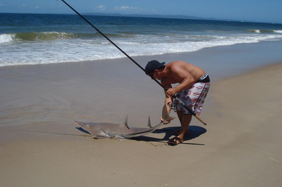 Als wir zusammenpackten und wieder retour fahren wollten, sahen wir cirka 10 Meter neben der Stelle wo wir im Meer gebadet haben einen Angler der etwas an der Leine „zappeln“ hatte. Hielten natürlich an um zu was es ist, und was zieht er raus?? EINEN HAI, wenn wir das vorher gesehen hätten, wären wir wahrscheinlich nicht so einfach hineingegangen! Gott sei Dank war es eine harmlose Sorte Hai, welche für Menschen ungefährlich ist.