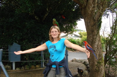 Die Straße dahin führte durch unberührte Eukalyptus- und Regenwälder (Außerdem waren sie ganz nach Tom’s Geschmack: steil und viele Kurven und so konnte er die Kurvenlage und die Bremsen unseres Campers testen.). Bei den „Green Mountains“ angekommen ließen wir uns den „Tree-Top Canopy Walk“ nicht entgehen. In 15 Meter Höhe ging’s auf einer Reihe von Hängebrücken durch die Baumkronen und das ganze zur unserer Freude kostenlos. Anschließend nutzten wir noch die Chance Fotos mit ziemlich zutraulichen Vögeln zu machen.